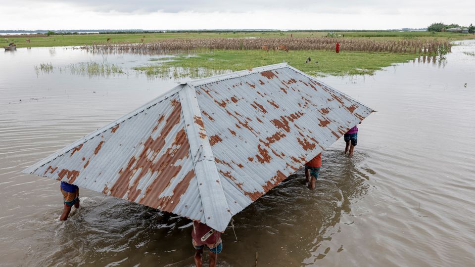 Menschen im Norden Bangladeschs helfen einem Mann,das Dach seines Hauses zu verlegen – der alte Standort droht,durch Erosion zerstört zu werden